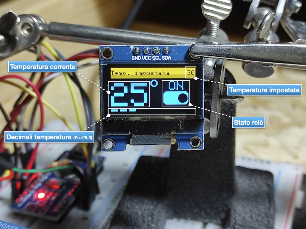Il termostato che ho realizzato utilizza quindi un piccolo display OLED da 128×64 pixel per mostrare a video le informazioni, un encoder per ricevere le impostazioni dall’utente, la EEPROM di Arduino per salvare dati in memoria, il sensore DS18B20 per leggere la temperatura, un relè per comandare il carico e per essere sicuro che il programma non rimanga mai in stallo, ho utilizzato il watchdog come visto nell’ultimo articolo.